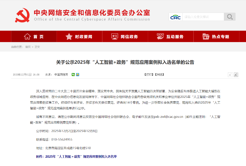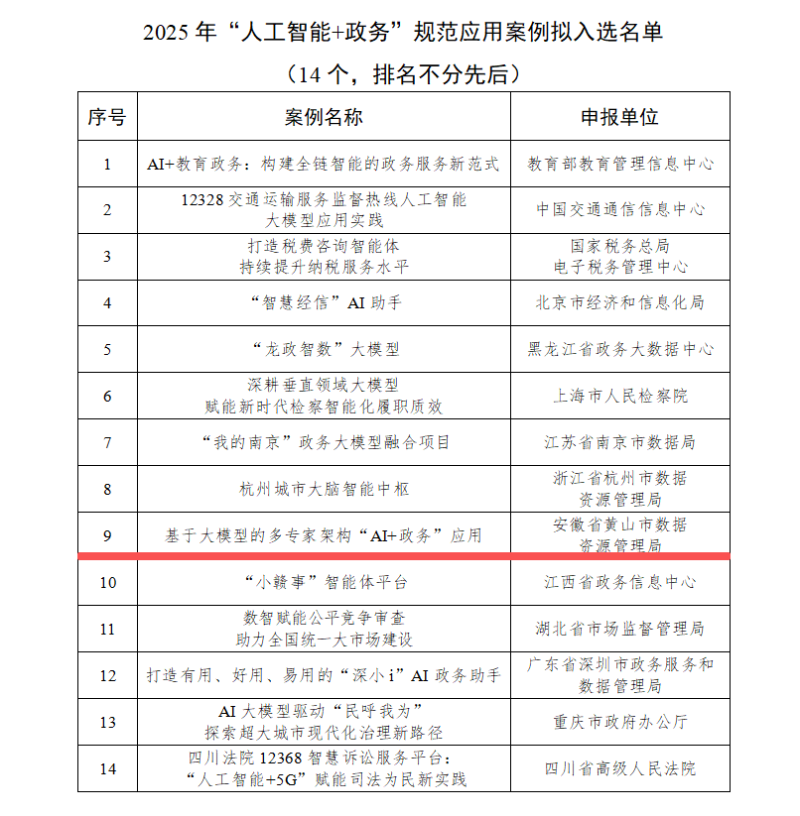 日前,中央網信辦信息化發(fā)展局指導、中國網絡社會組織聯合會組織評選2025年“人工智能+政務”規(guī)范應用案例,黃山市“基于大模型的多專家架構‘AI+政務’項目”成功入選,是我省唯一入選的“人工智能+政務”項目。2025年9月,黃山市“AI+政務”項目獲評2025世界制造業(yè)大會“安徽省信息化十件大事”。本次入選中央網信辦“人工智能+政務”規(guī)范應用案例,標志著黃山市“AI+政務”項目,已成為引領全國“人工智能+政務”項目的標桿之一。