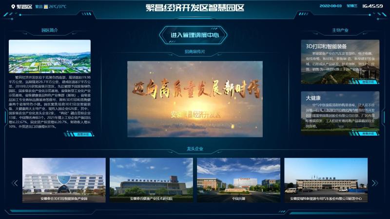 充分運用大數(shù)據(jù)、區(qū)塊鏈、物聯(lián)網(wǎng)、數(shù)字孿生等新興技術(shù),對園區(qū)綜合數(shù)據(jù)進(jìn)行采集、處理、分析,利用LED大屏、移動終端等設(shè)備,接入顯示各瞭望點和監(jiān)控端等視頻數(shù)據(jù),構(gòu)建園區(qū)統(tǒng)一管理調(diào)度中心,實現(xiàn)園區(qū)一張圖管理。主要包含園區(qū)總覽一張圖、黨建一張圖、產(chǎn)業(yè)招商一張圖、項目監(jiān)管一張圖、經(jīng)濟運行一張圖等內(nèi)容。同時預(yù)留數(shù)據(jù)接口,實現(xiàn)與智慧繁昌平臺的對接,支持將數(shù)據(jù)及相關(guān)模塊接入智慧繁昌運營中心。